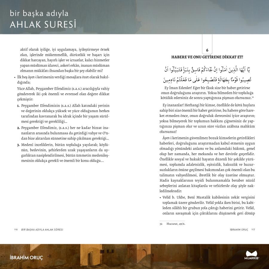 İbrahim Oruç, kelimeler ve mesajlar çerçevesinde incelemelerine Hucurat Sûresi ile devam ediyor. Müslümanın edep, ahlak ve hadd sınırlarını bildiren sûreden, günümüz hayatına alacağımız mesajlar.